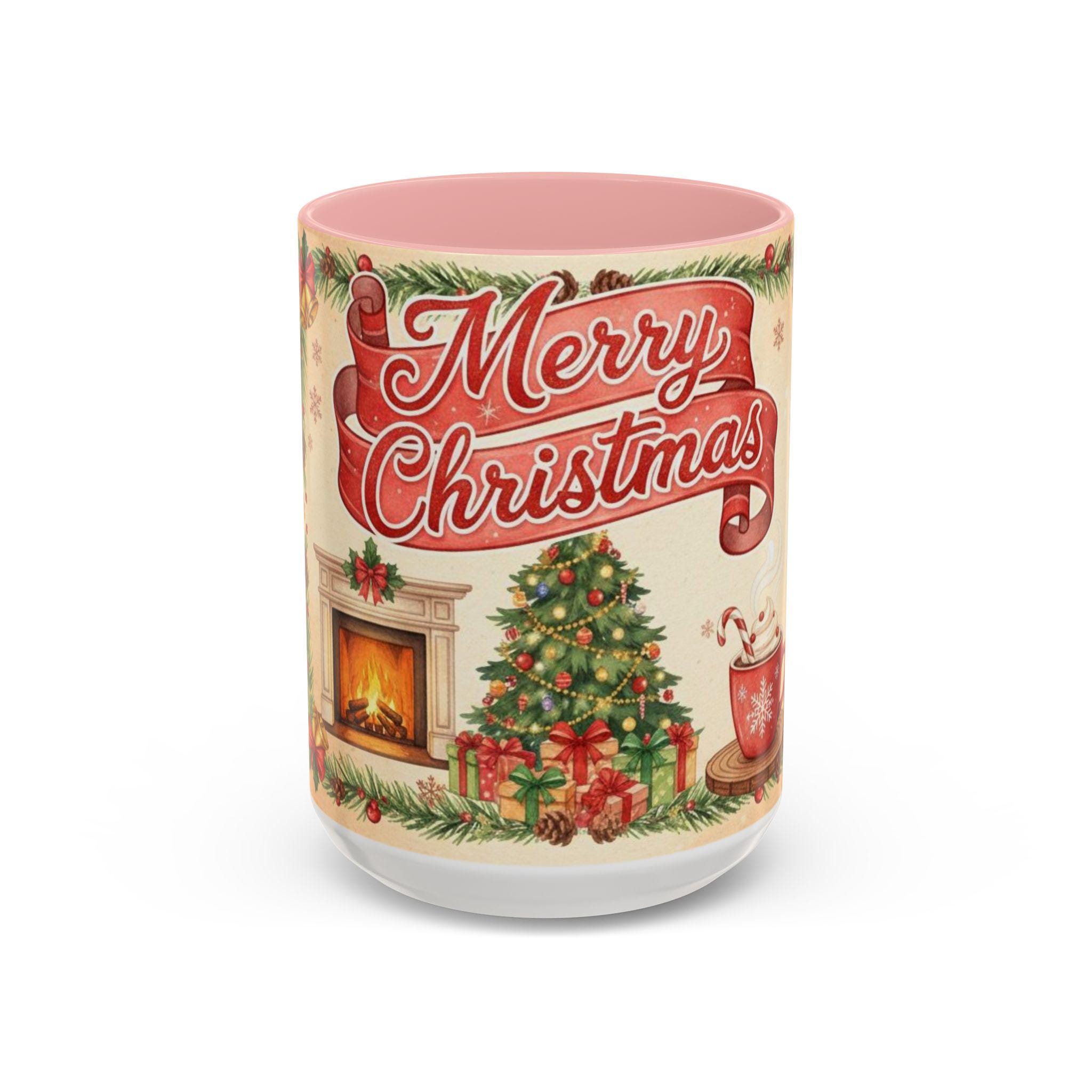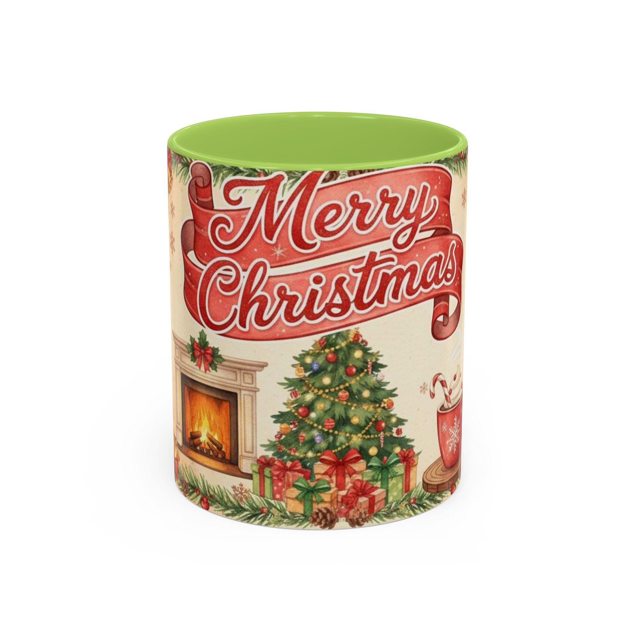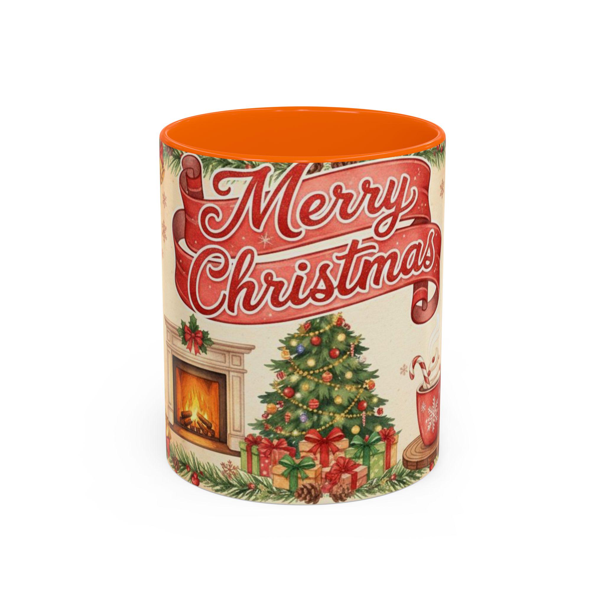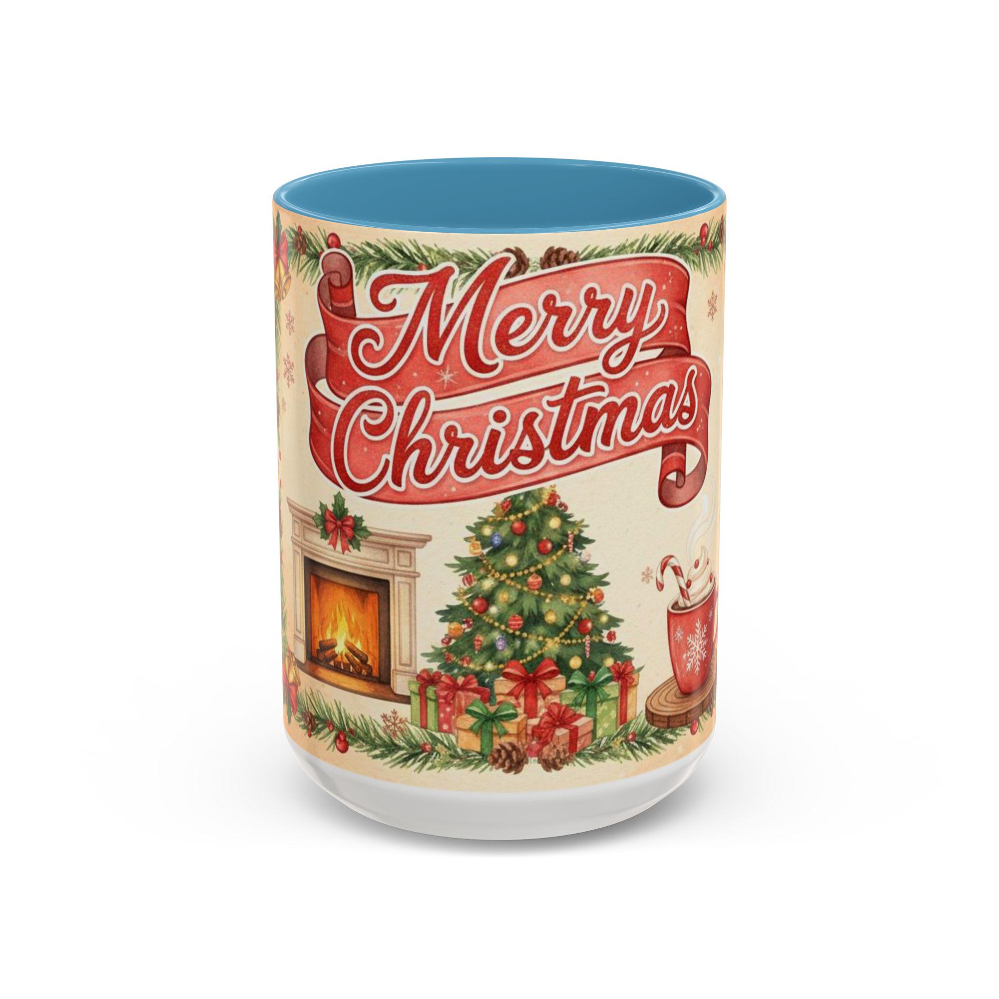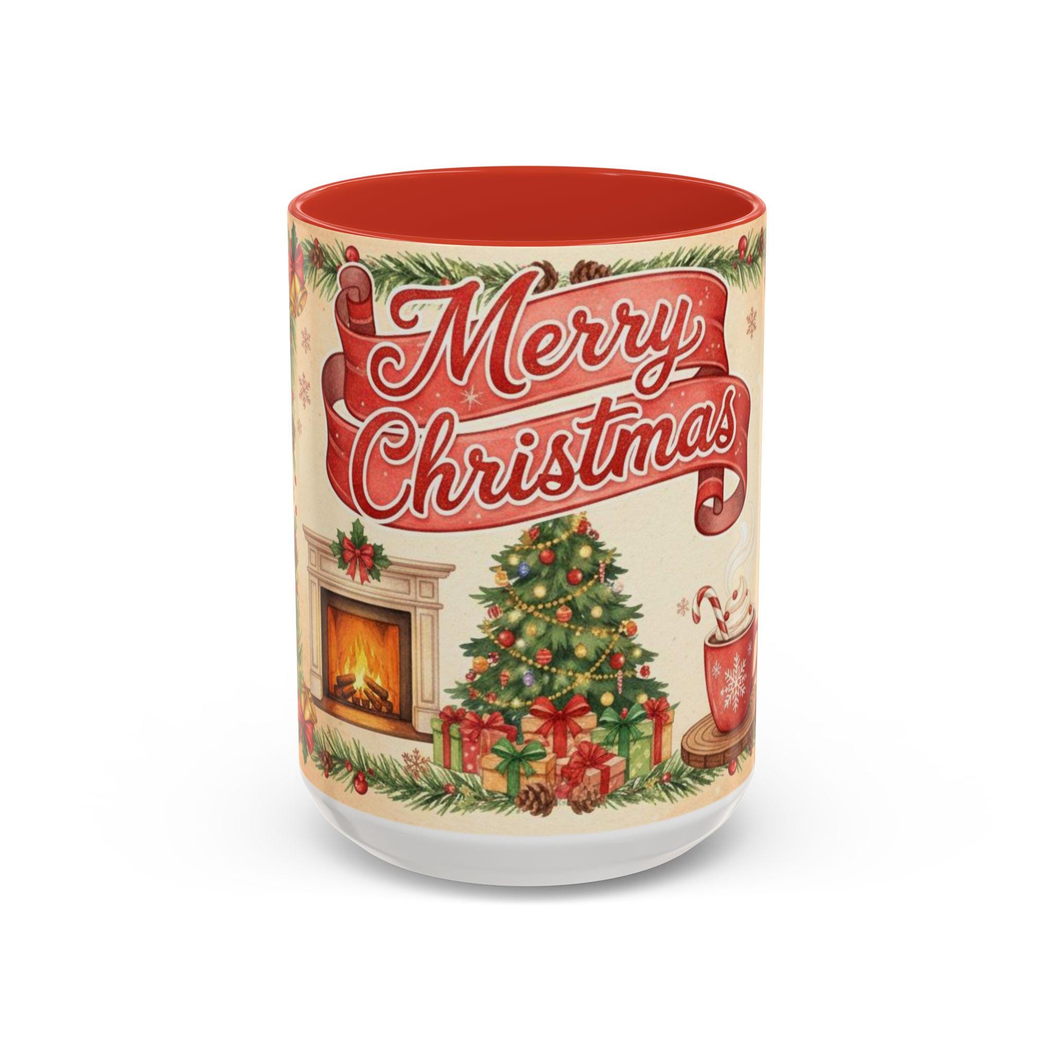 Warmth in both hands and heart. This ceramic mug wraps a vintage-style Christmas scene around its glossy surface — a glowing fireplace, a decorated tree, wrapped presents and a steaming cocoa cup beneath a cheerful “Merry Christmas” banner. The colored interior and handle add a striking contrast to the white body, making the artwork pop while your drink stays cozy. Use it during quiet mornings beside twinkling lights or bring it out when friends gather for cocoa and carols. The comfortable C-handle and two size options mean you can choose the cup that fits your ritual, whether it's a strong morning brew or a slow, milky hot chocolate by the tree.