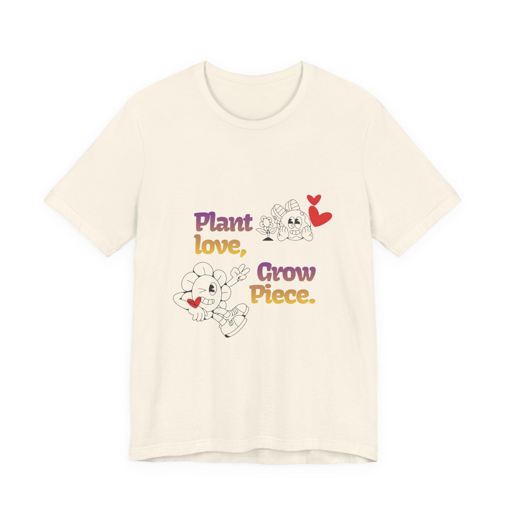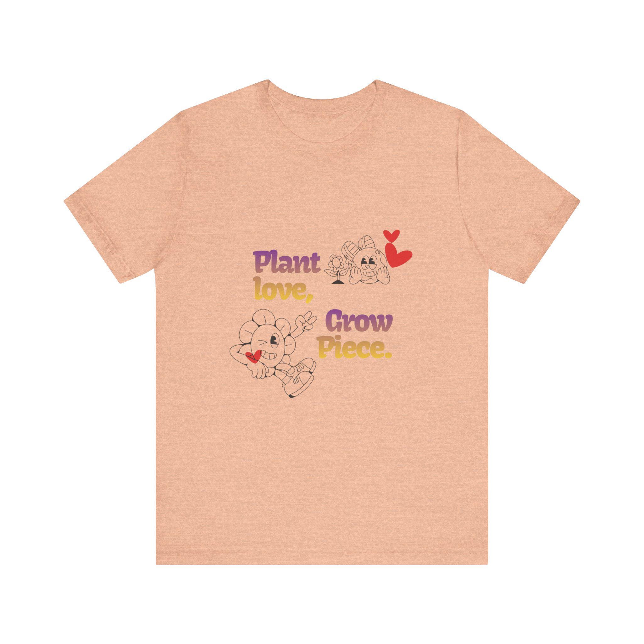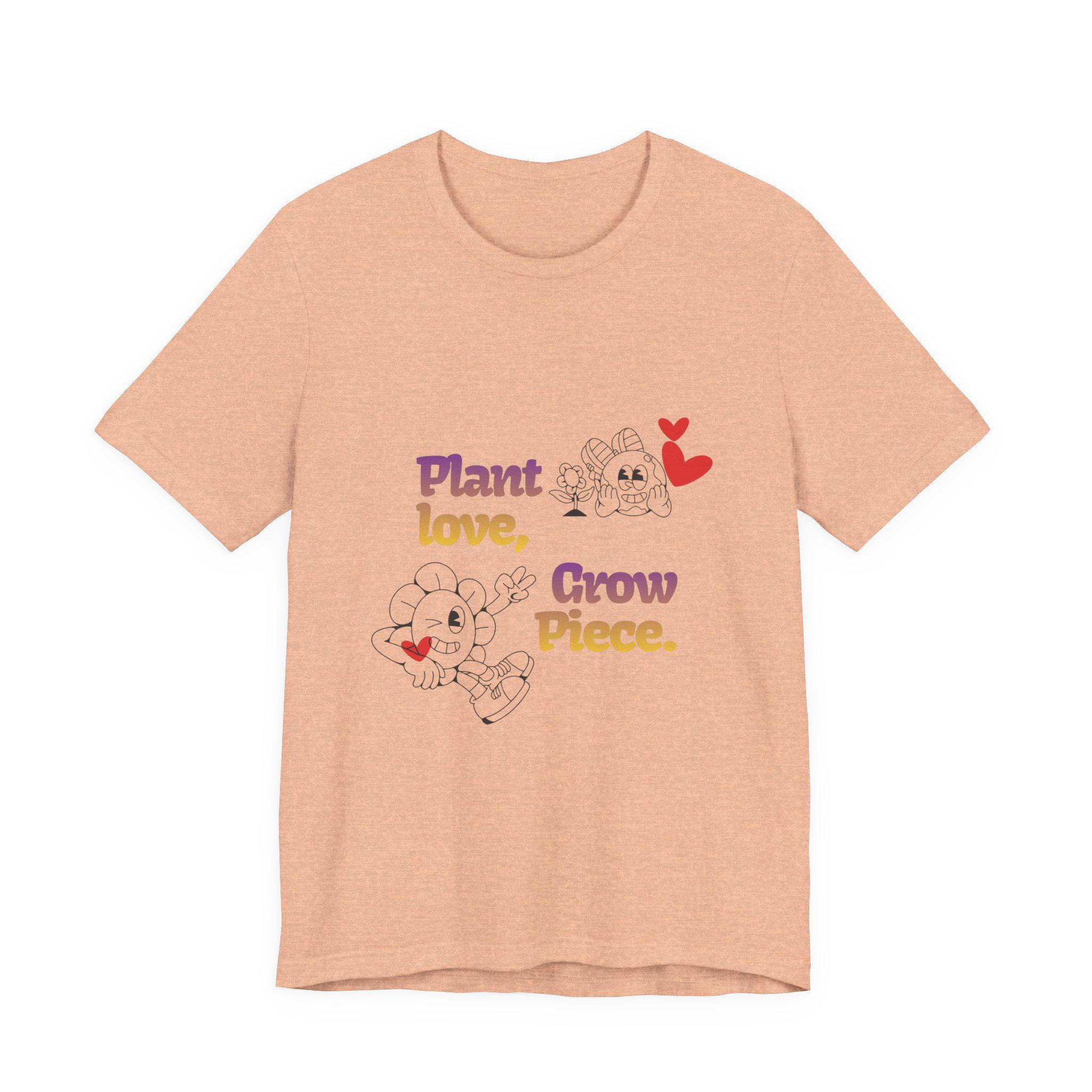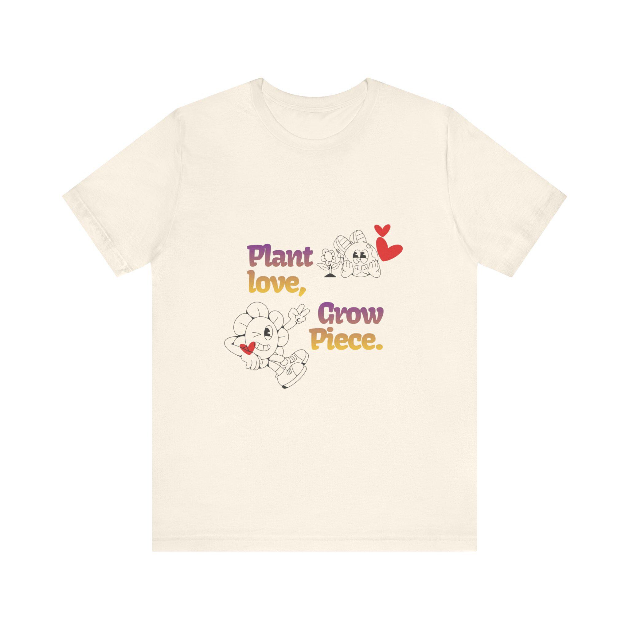Soft, breathable cotton meets quiet optimism. This lightweight jersey tee carries a gentle, hand-drawn plant illustration and the warm message “Plant love, grow peace.” It sits close to the body without feeling tight, so the design reads clearly whether you're watering succulents on the balcony or meeting friends for coffee. The crew neckline and tidy side seams keep the silhouette neat while shoulder tape ensures the shirt stays shaped through repeat wear. Wear it on slow mornings, in community gardens, or paired with a cozy cardigan for low-key activism — a calm reminder to tend to what matters.