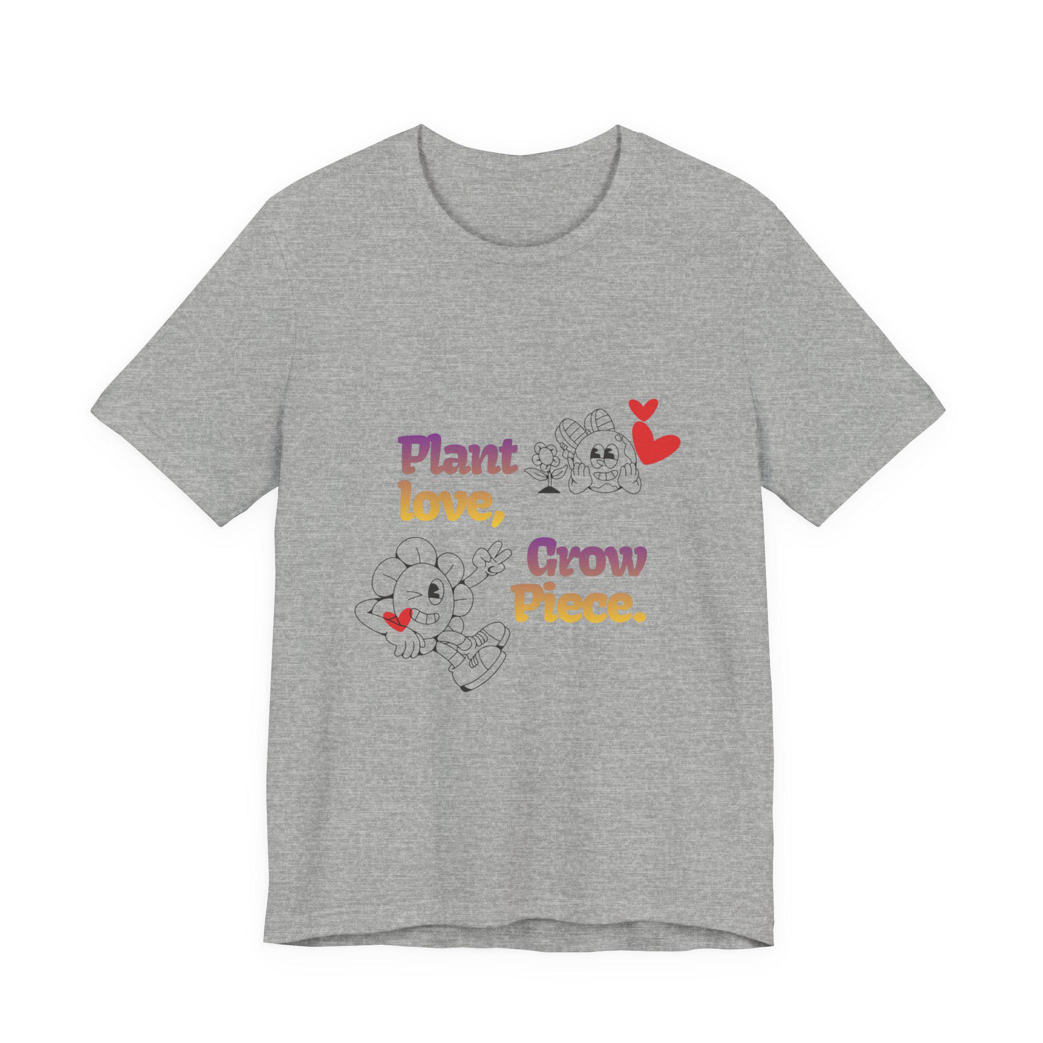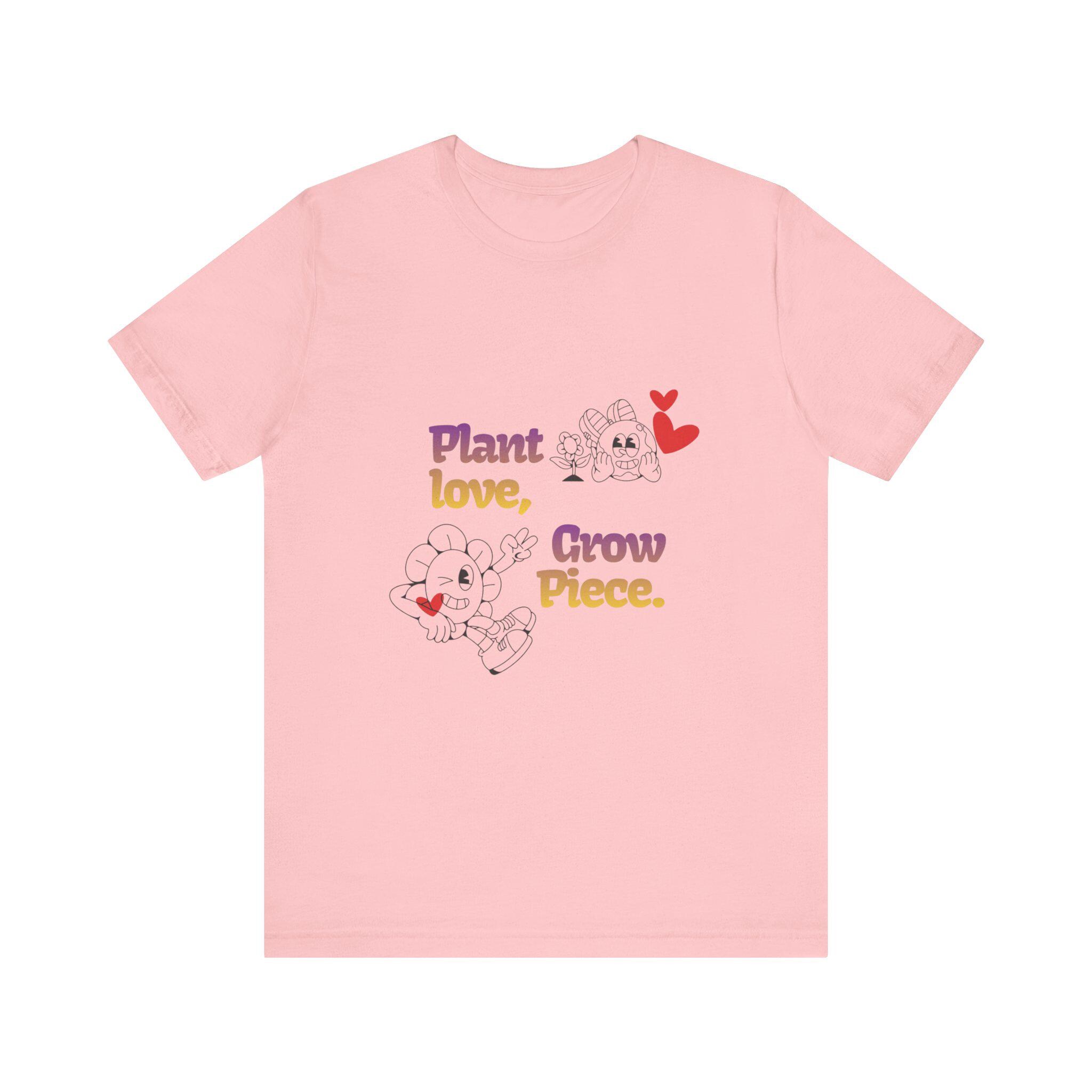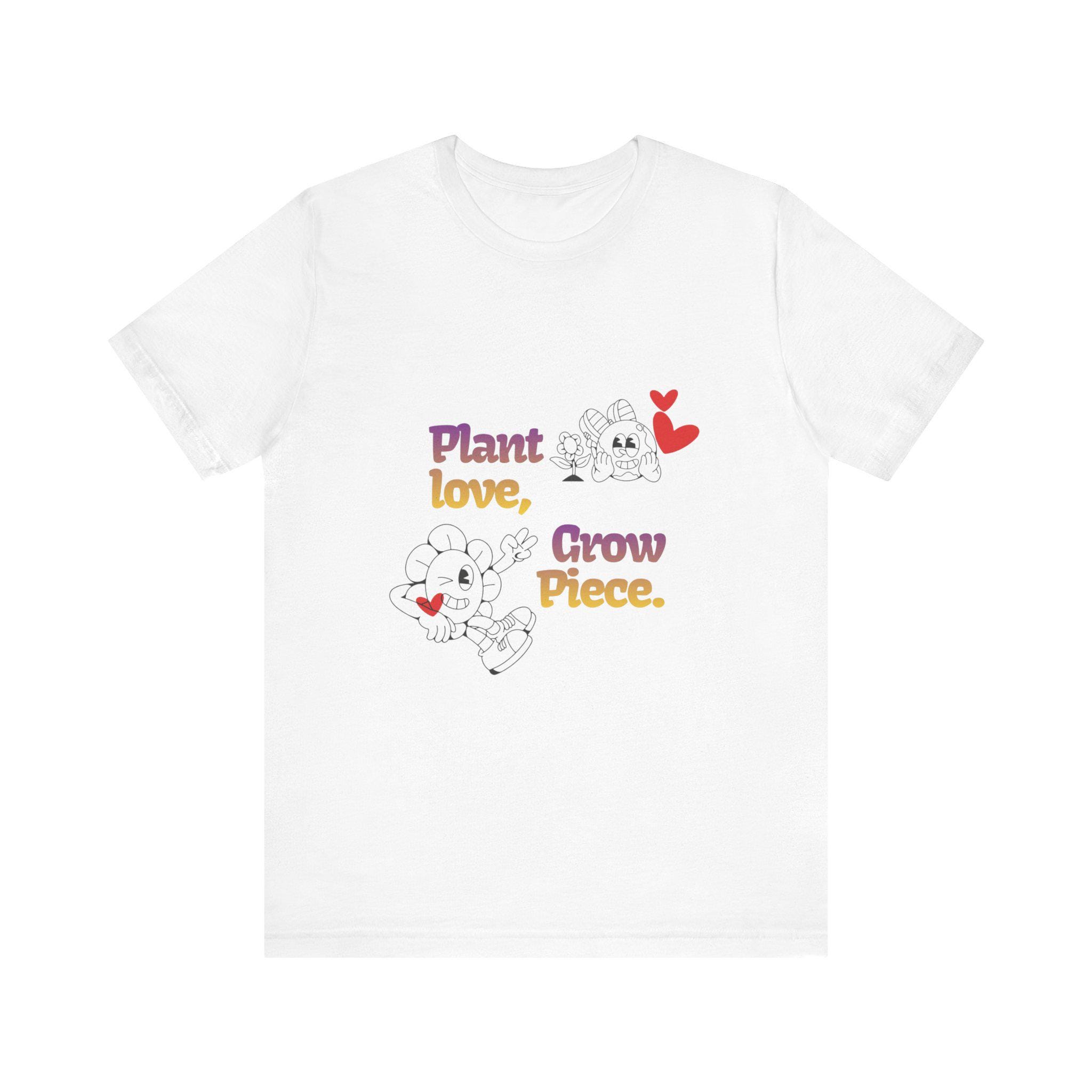 Soft, breathable cotton meets quiet optimism. This lightweight jersey tee carries a gentle, hand-drawn plant illustration and the warm message “Plant love, grow peace.” It sits close to the body without feeling tight, so the design reads clearly whether you're watering succulents on the balcony or meeting friends for coffee. The crew neckline and tidy side seams keep the silhouette neat while shoulder tape ensures the shirt stays shaped through repeat wear. Wear it on slow mornings, in community gardens, or paired with a cozy cardigan for low-key activism — a calm reminder to tend to what matters.