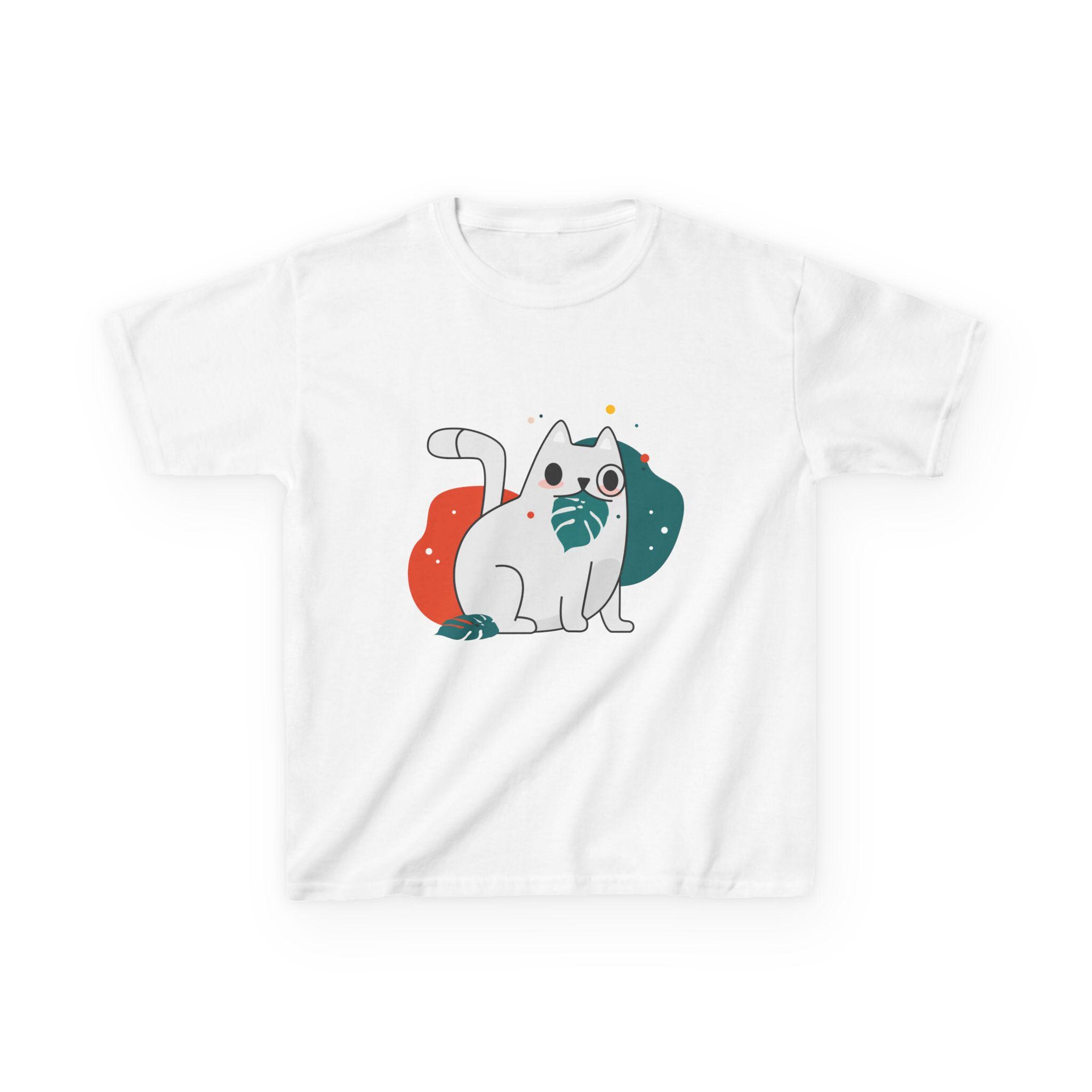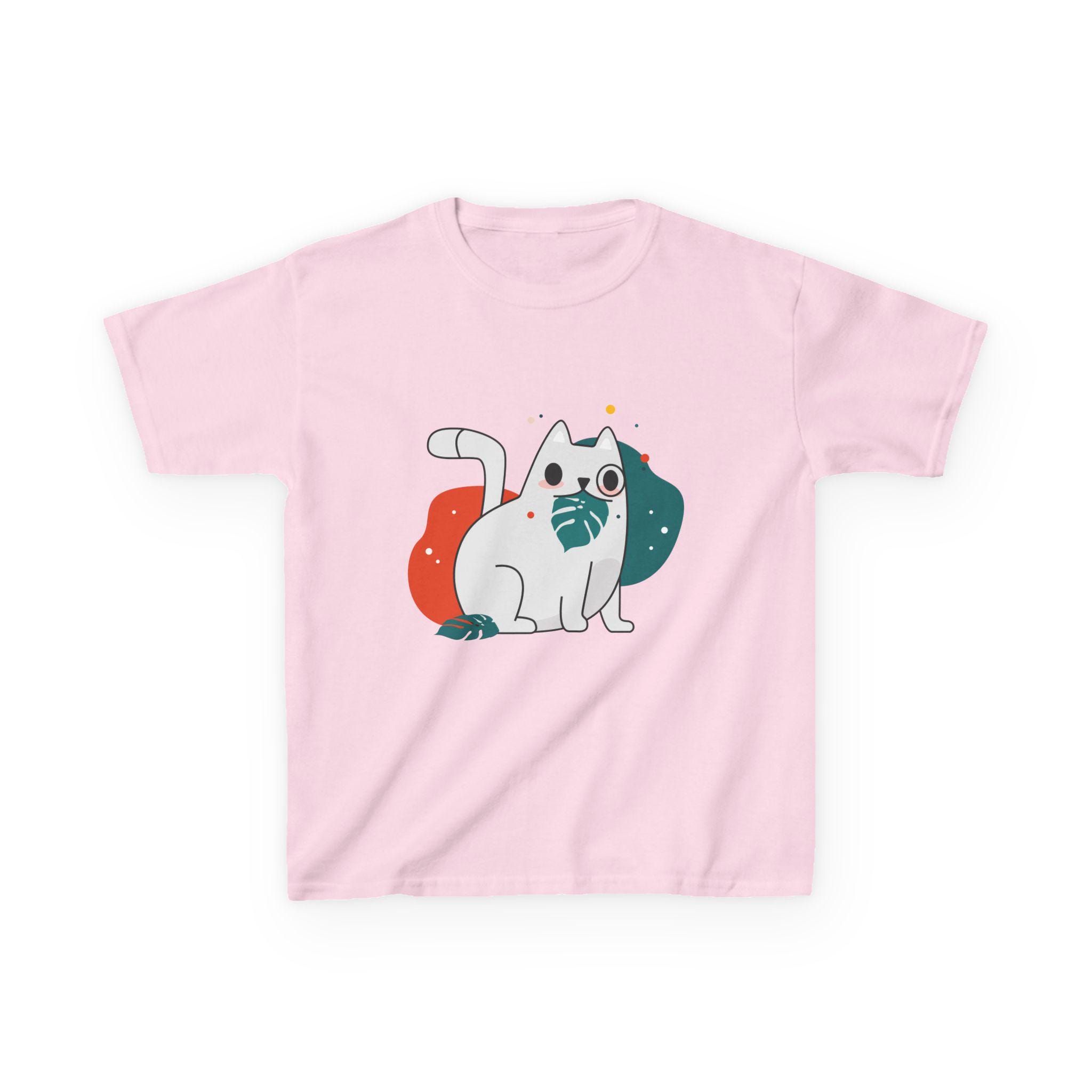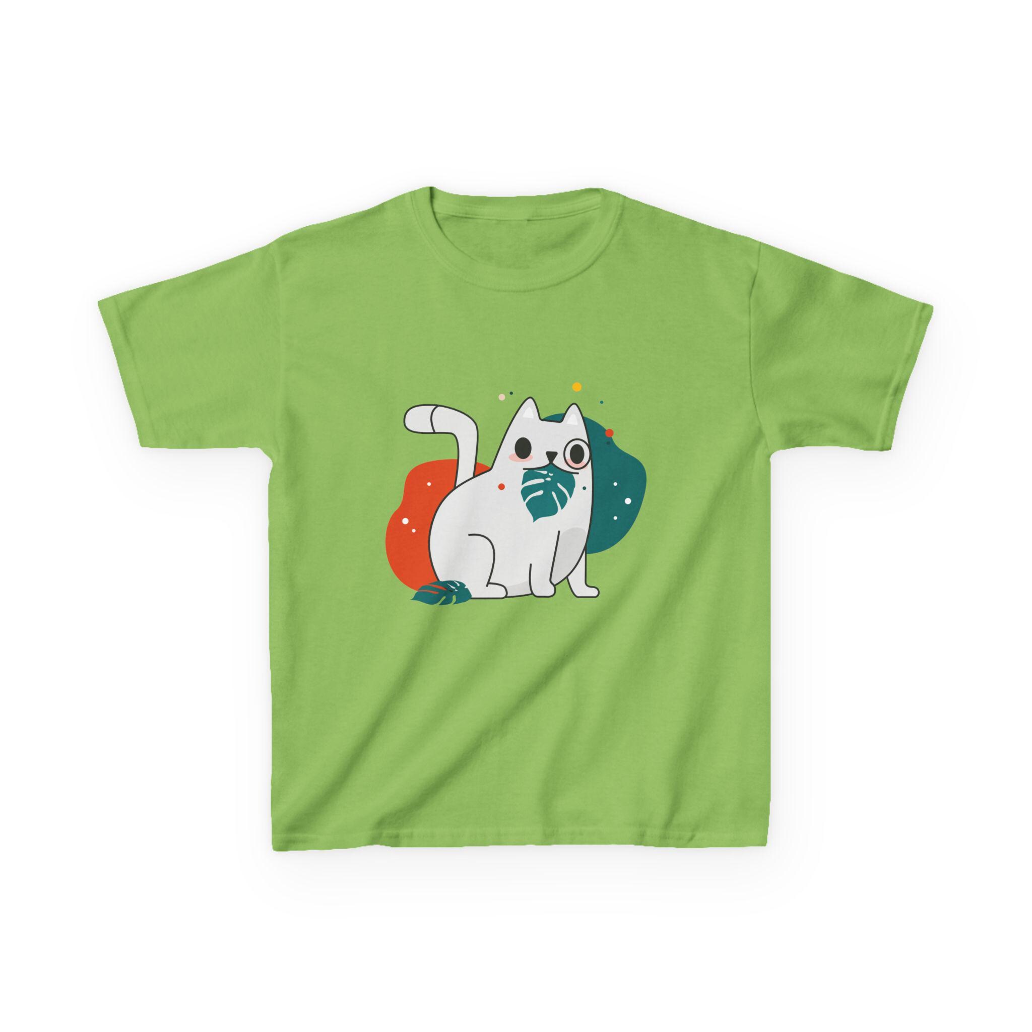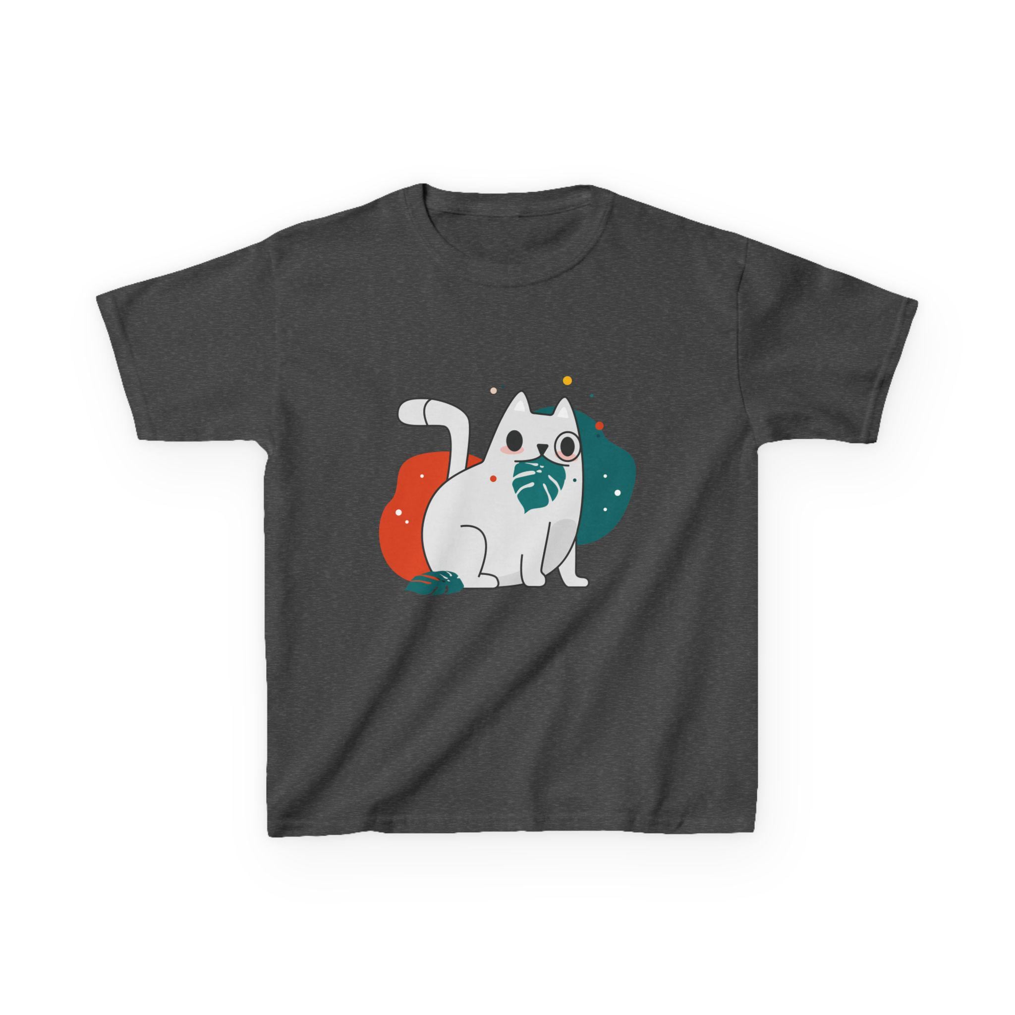 Playful Cat Holding Leaf Kids Tee | Cute Kitty Illustration