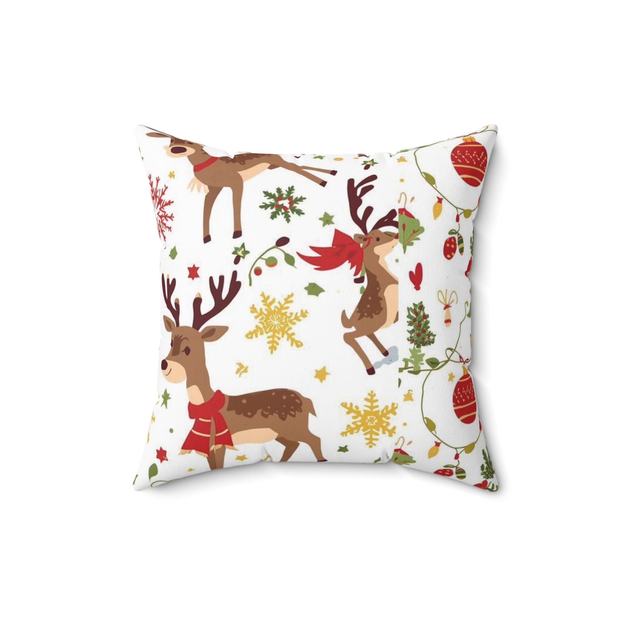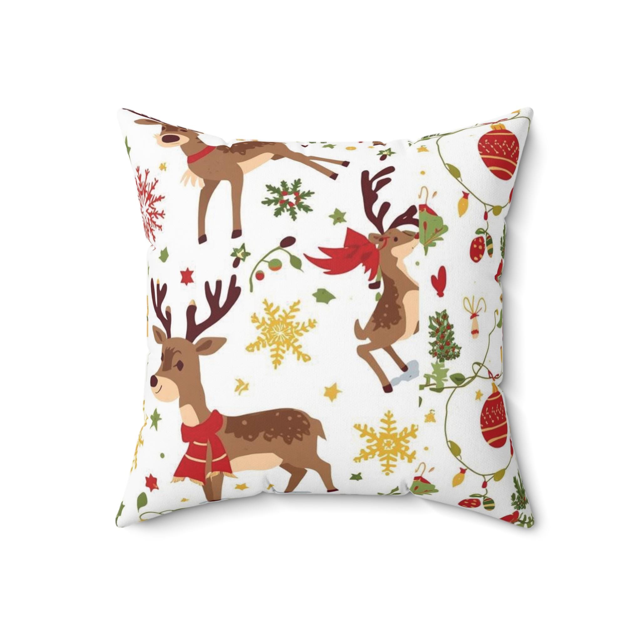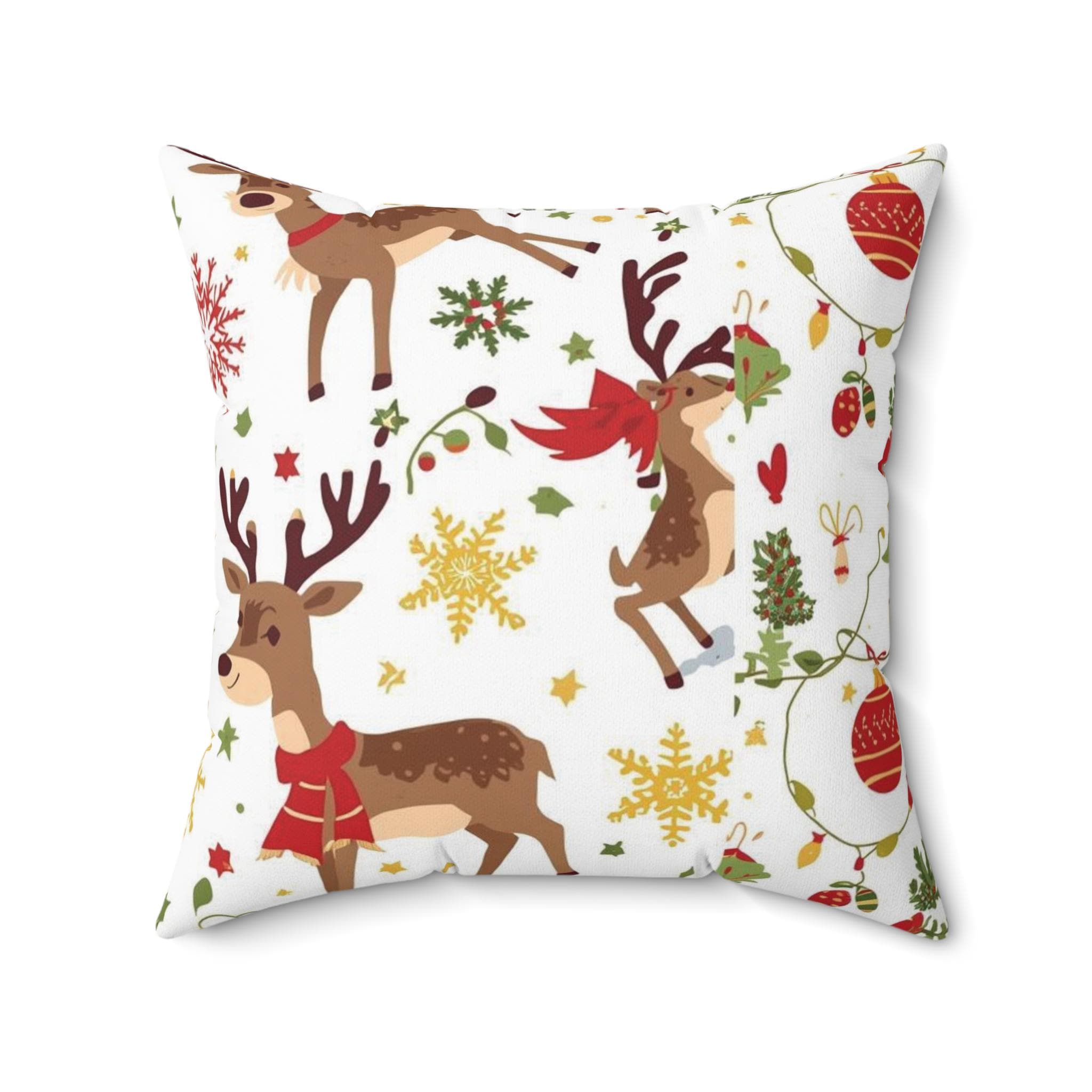 Bring a cozy, whimsical touch to holiday spaces with this spun polyester square pillow. Cheerful reindeer, tiny ornaments, and delicate snowflakes wrap around a soft background, giving any couch, armchair, or bed a warm, hand-decorated feeling. The double-sided print keeps the pattern vivid from every angle. Light and resilient spun polyester holds its shape and resists wrinkles, while the included recycled polyester insert is intentionally slightly oversized so the pillow fluffs up full and plump once assembled. Tuck it into a reading nook, layer it on a sofa with textured knits, or scatter a few on a guest bed to create a festive, cottage-inspired scene that feels like home.