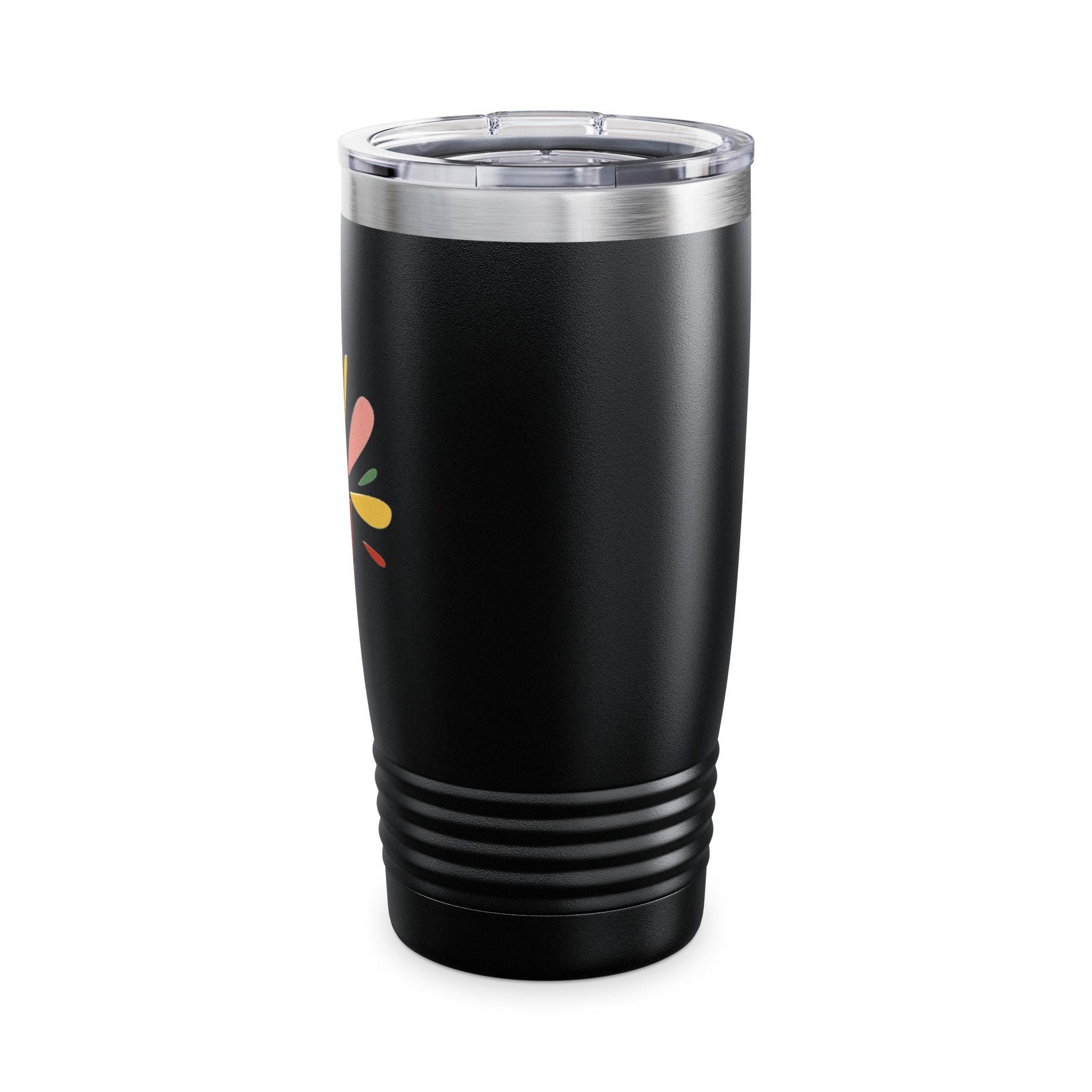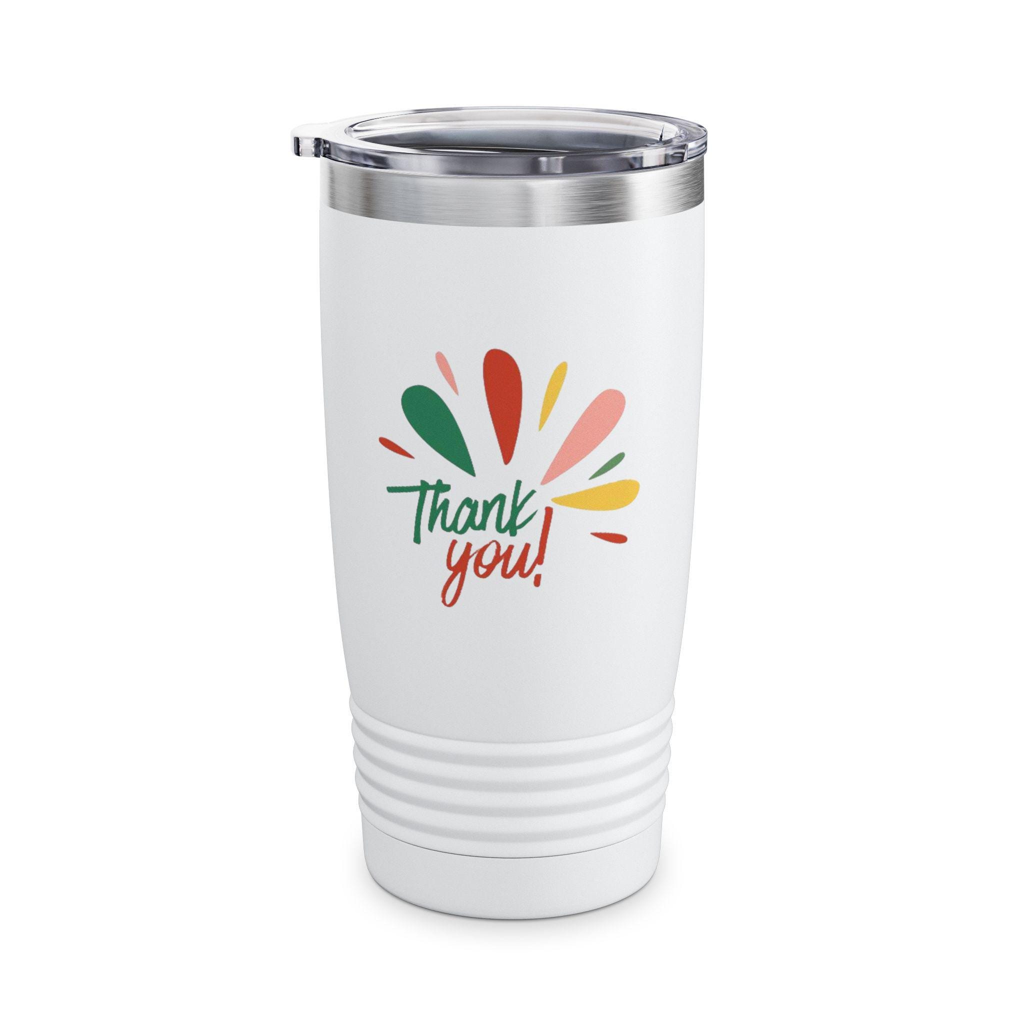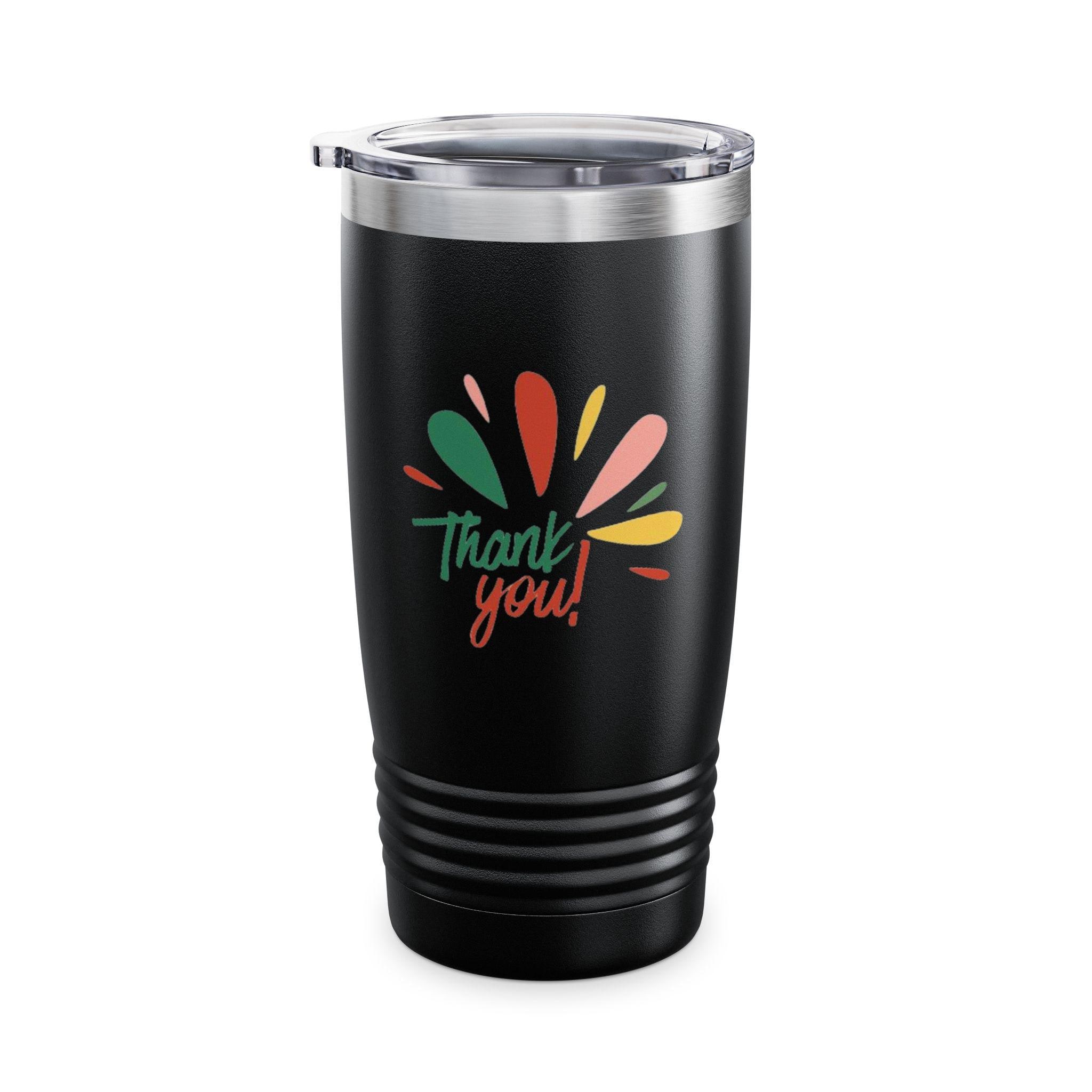 This 20oz ringneck tumbler brings bright, joyful energy to everyday sipping. The slim, stainless-steel double-wall keeps coffee hot for up to 12 hours and iced drinks cold for up to 24, while the ribbed base gives a confident grip whether you're commuting, crafting, or hosting. A clear push-on lid lets you sip easily without losing the view of the glossy, vibrant print — a cheerful “Thank you!” motif in warm, hand-drawn colors that pops against the smooth finish. Lightweight and easy to carry, it slips into cup holders and backpacks and becomes a small, sunny reminder to pause and appreciate the little moments.