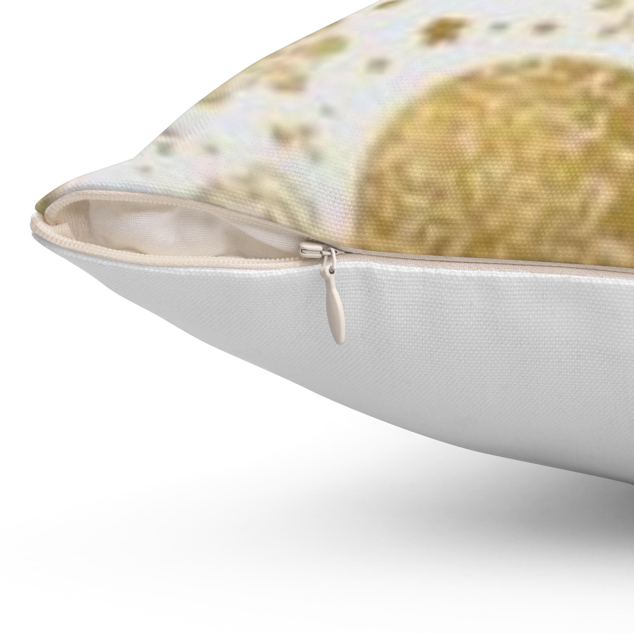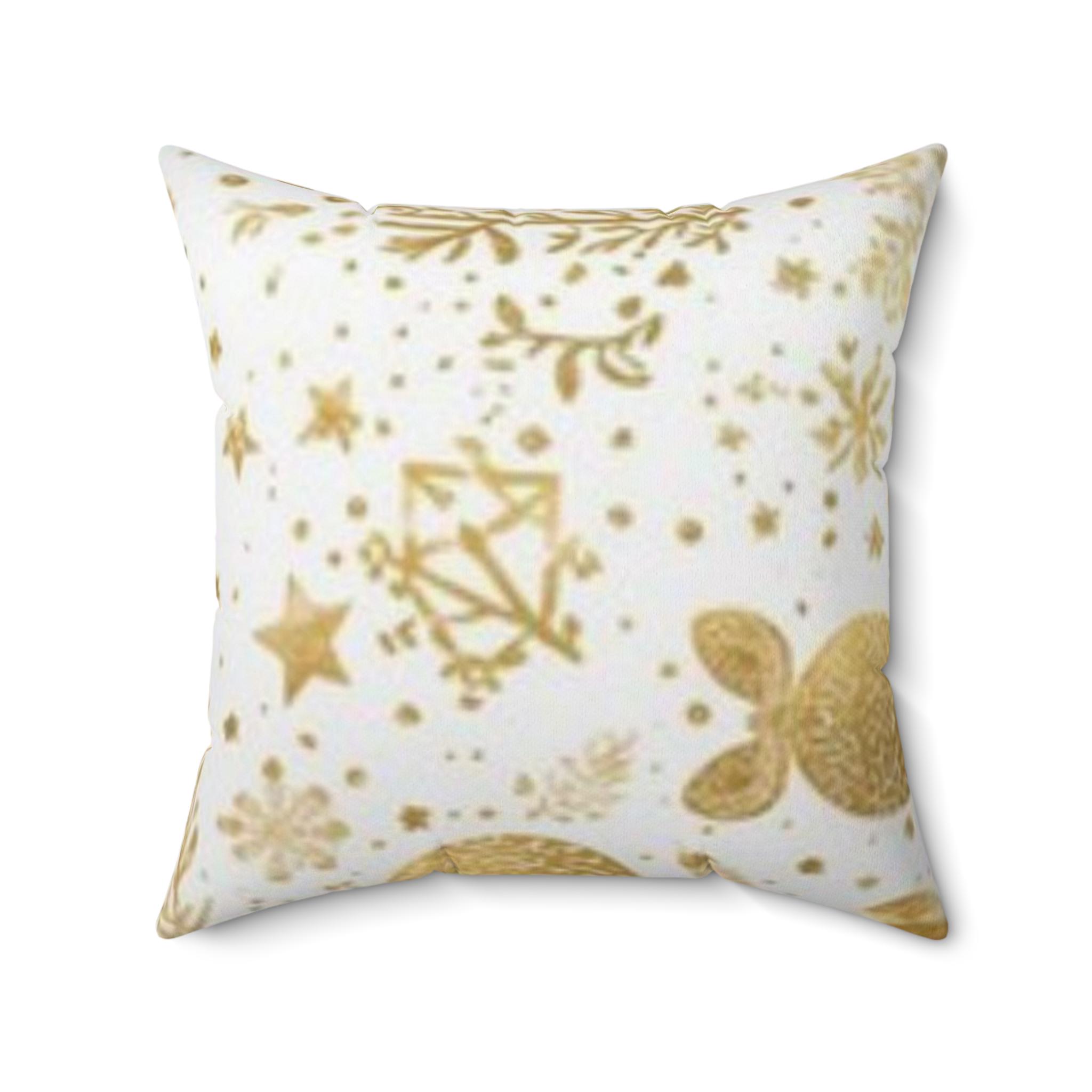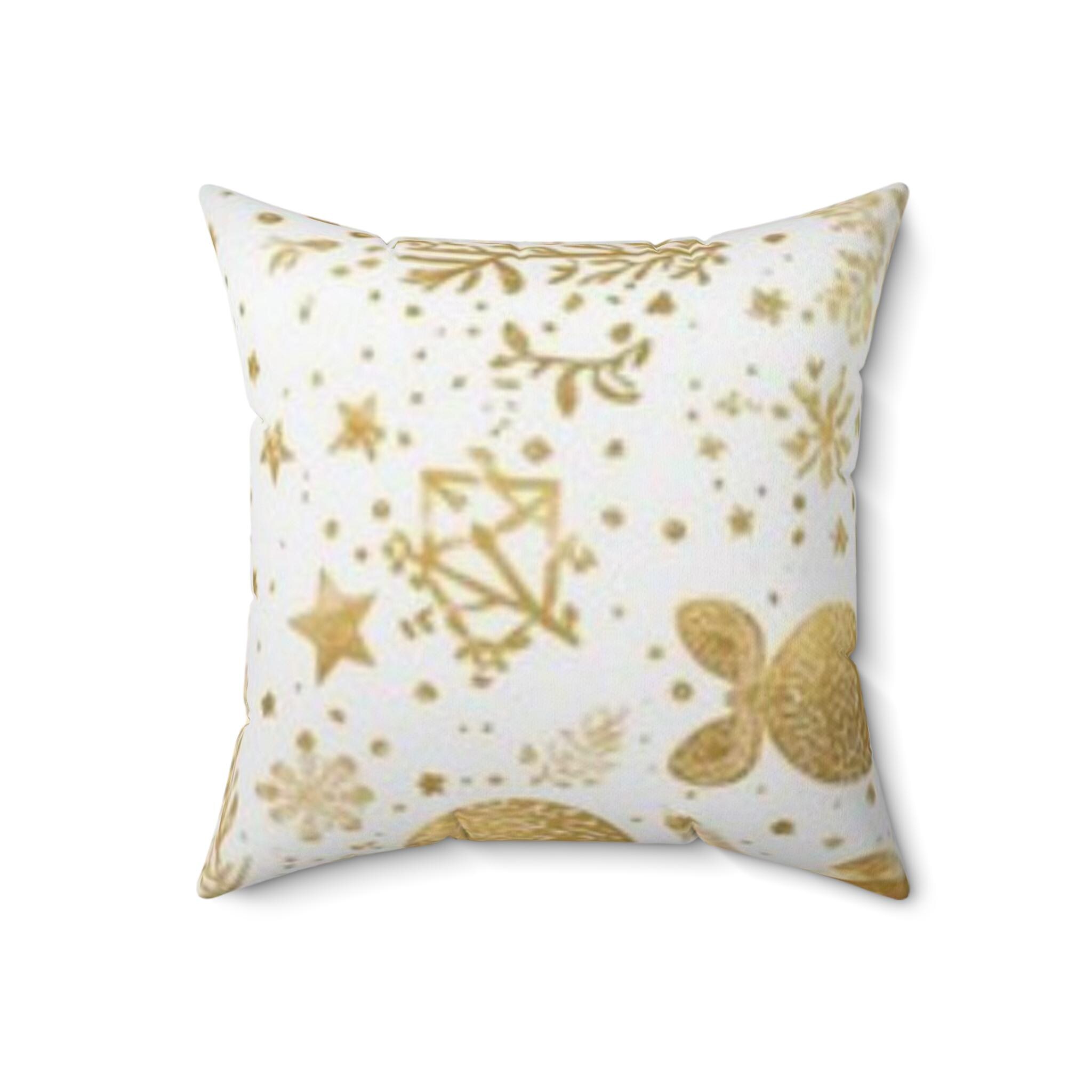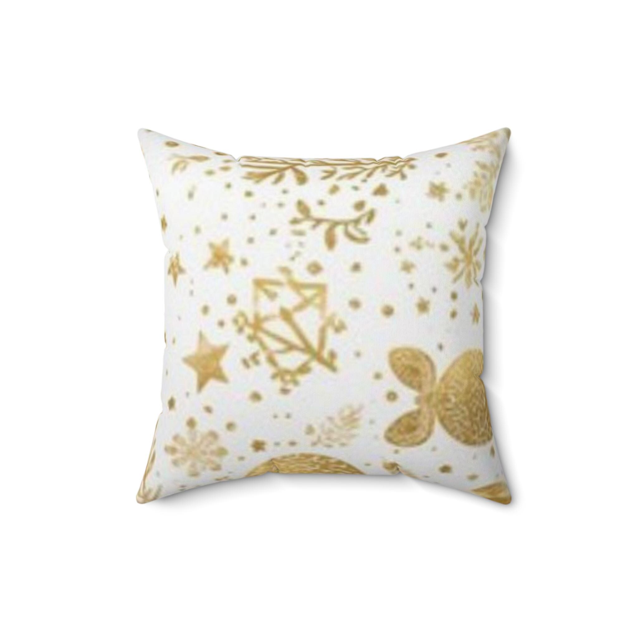 Soft and luminous, this square throw pillow brings a hint of cozy elegance to living rooms and reading nooks. The double-sided print shows delicate gold-toned botanical and star motifs scattered across a warm white background — like a quiet winter night dusted with soft light. The spun polyester cover keeps the print crisp and wrinkle-free, while the recycled polyester insert ships vacuum-packed and fluffs into a generously full shape once assembled. Tuck it on a sofa, layer it on a bed, or place it in a sunlit window seat to add gentle shimmer and a calm, handcrafted feel to everyday spaces.