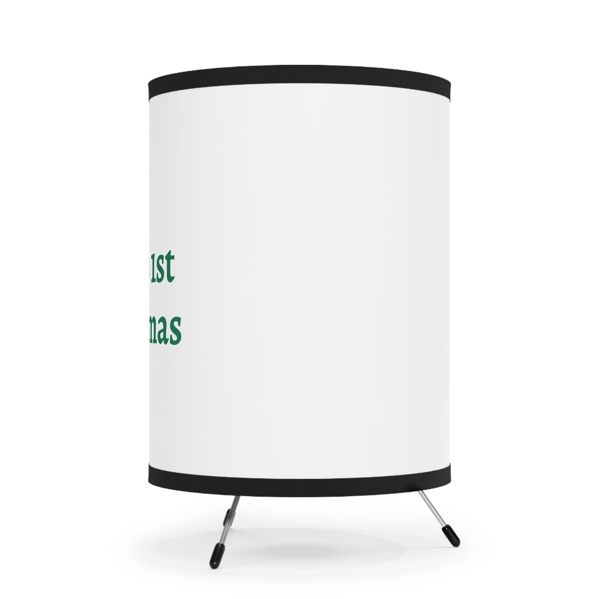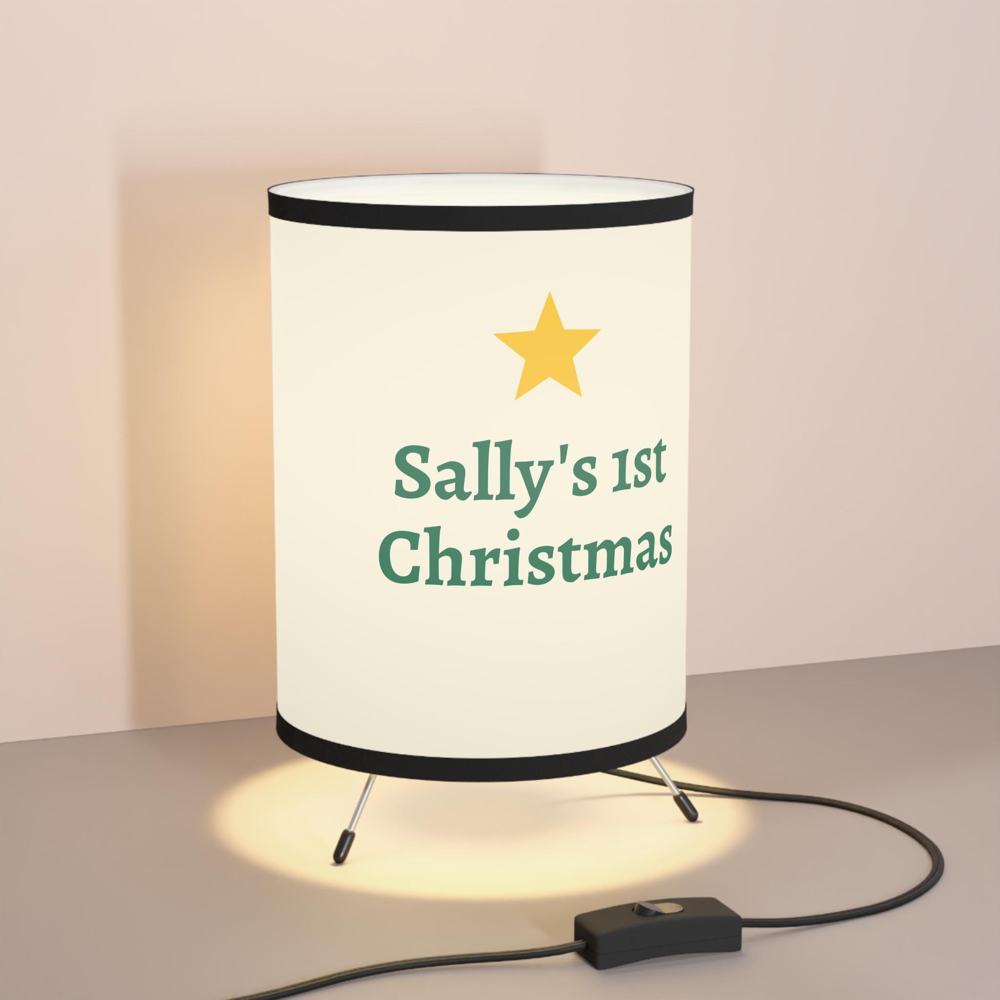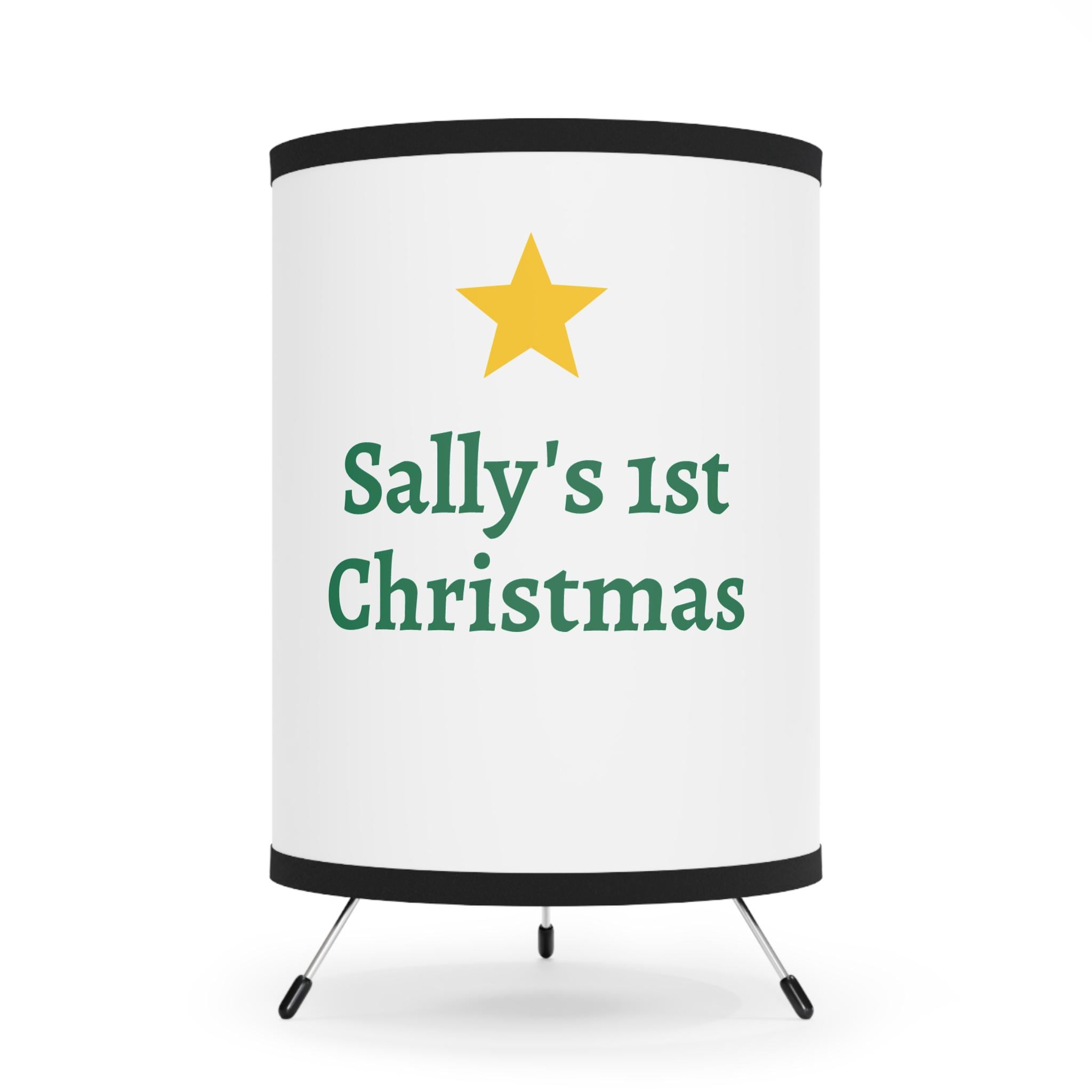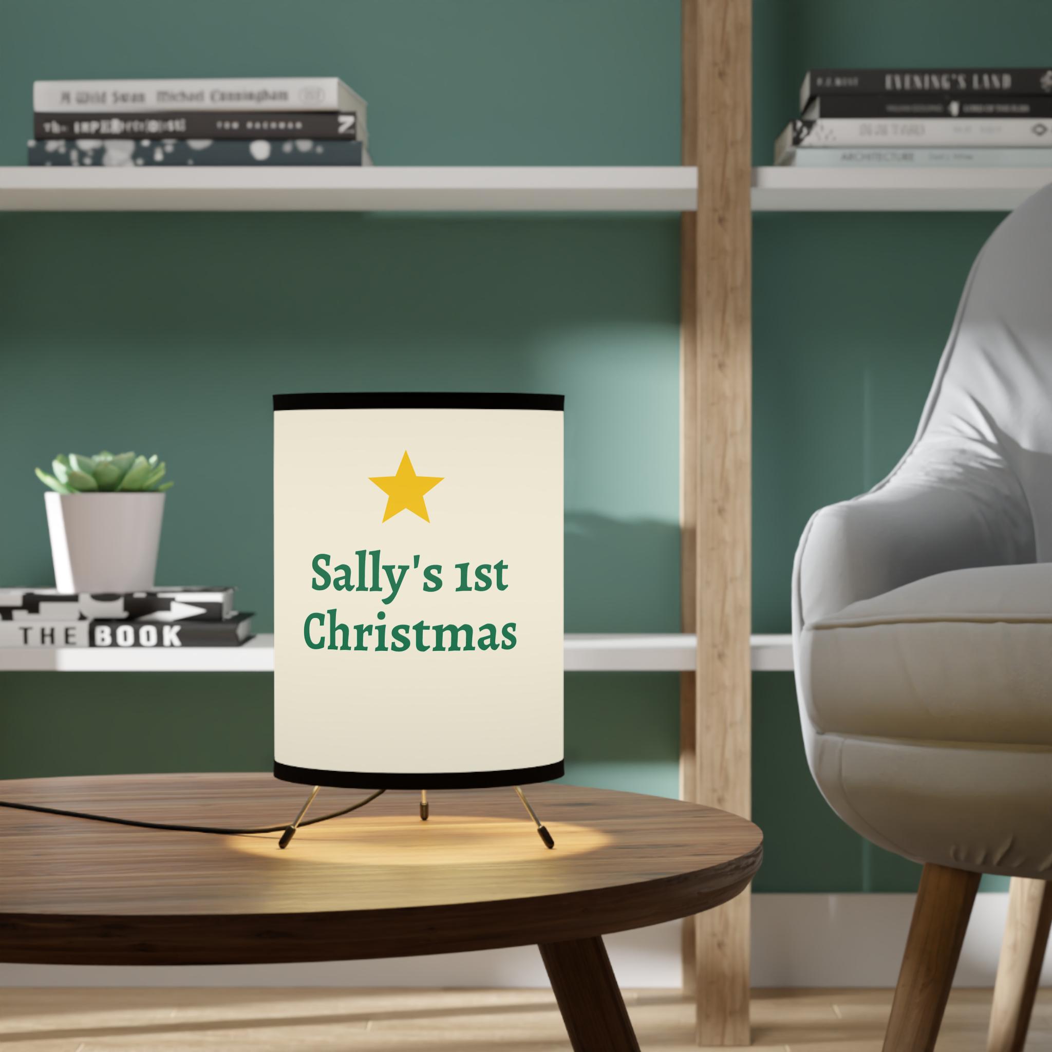 A warm, nostalgic tripod lamp with a high-resolution printed fabric shade designed to celebrate a child's first Christmas. The soft polyester shade wraps the light in a gentle glow, bringing out the green text and golden star while the galvanized steel tripod keeps the piece stable and modern. It’s a cozy accent for a nursery shelf, holiday corner, or family room — quiet, personal lighting that carries a memory. Simple to plug into North American outlets, it pairs easily with LED bulbs for a soft, sleep-friendly glow.
