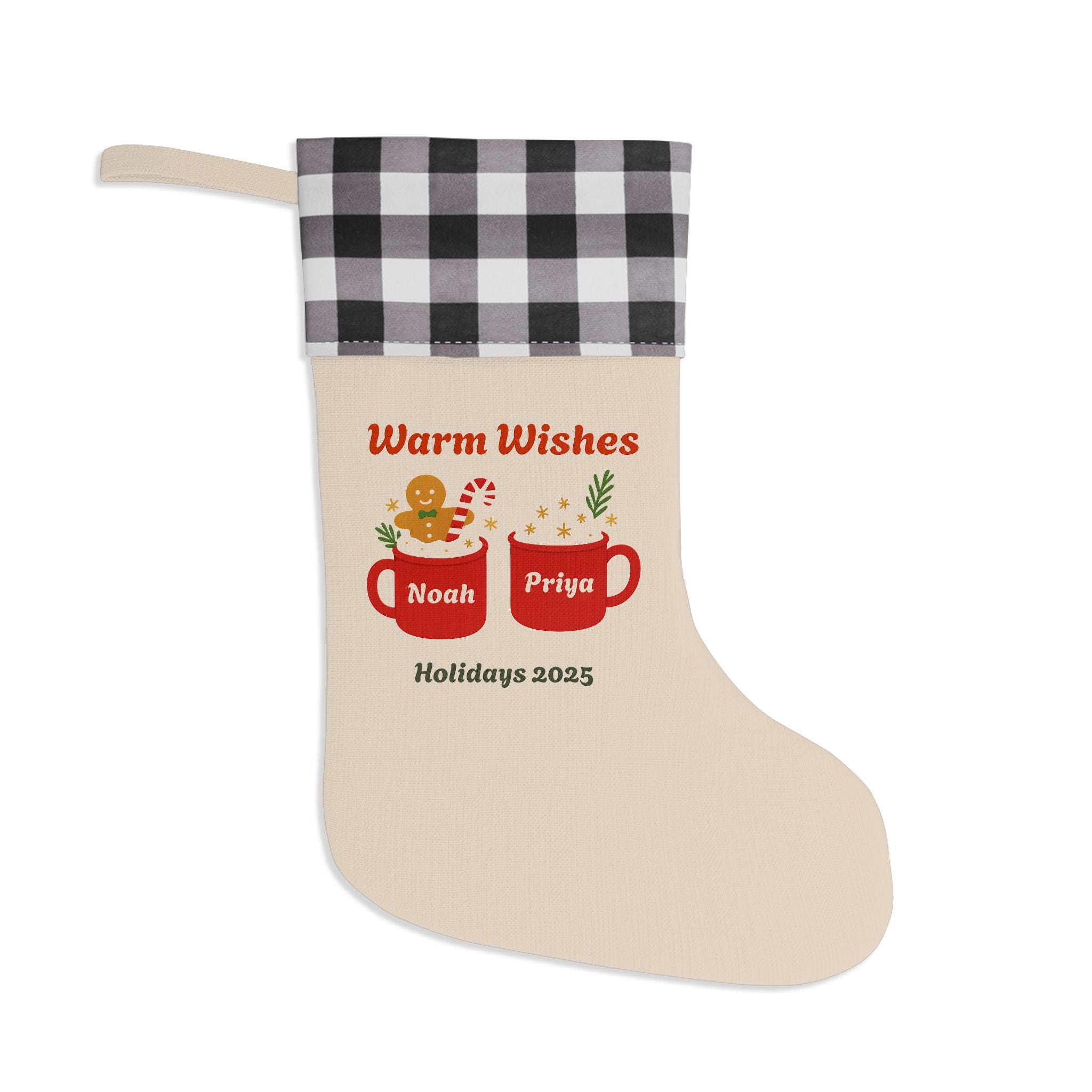 A cozy, rustic stocking that brings warm, homey charm to holiday tablecloths. The linen boot offers a soft, vintage texture while the buffalo plaid polyester cuff adds classic, cabin-style contrast. Sized to hold generous surprises, this stocking hangs easily by its loop and shows a single-sided, cheerful design—two red mugs and gingerbread figures with personalized names—ready to make a family moment feel deliberate and warm. Choose red/black or white/black cuff options to match your hearth and holiday palette.