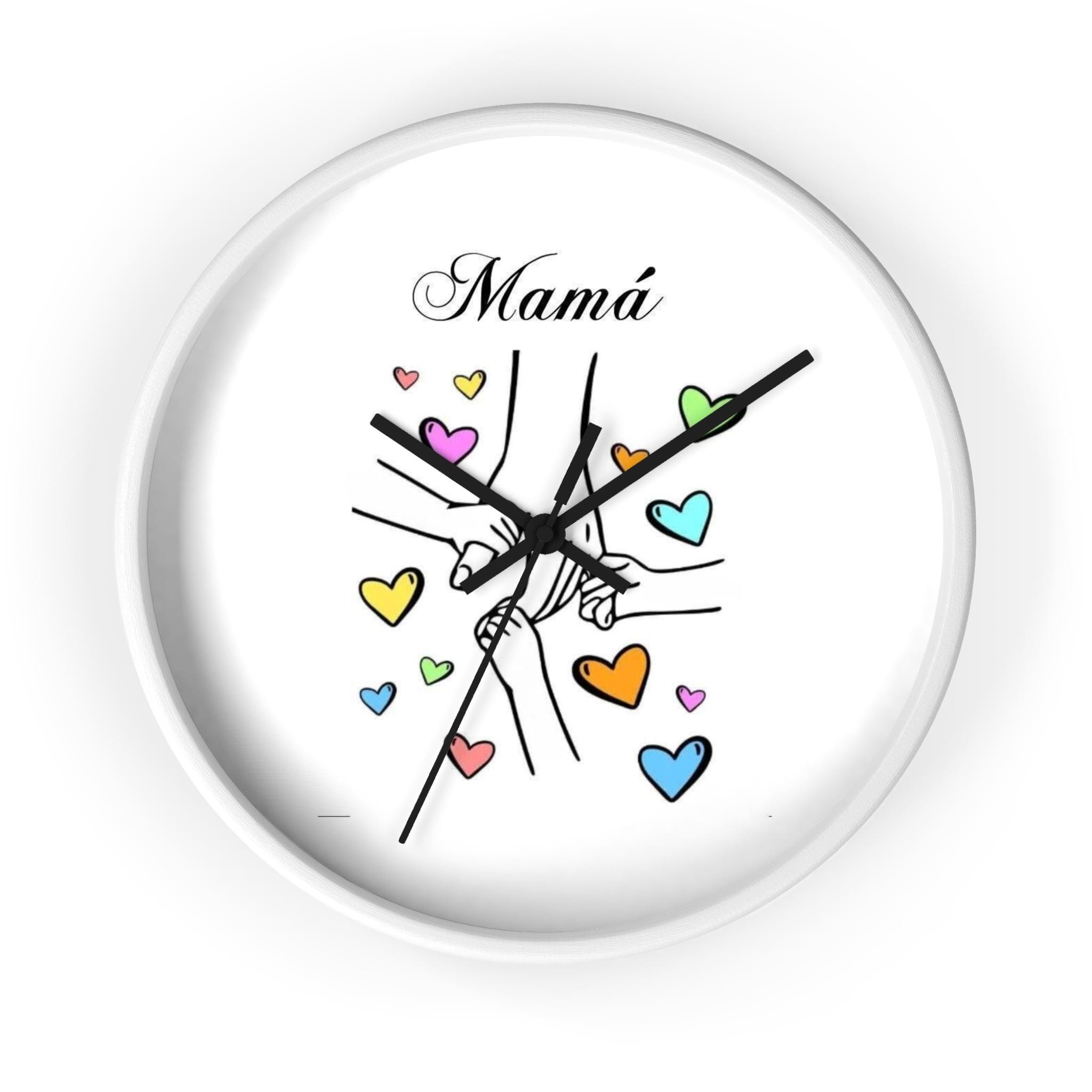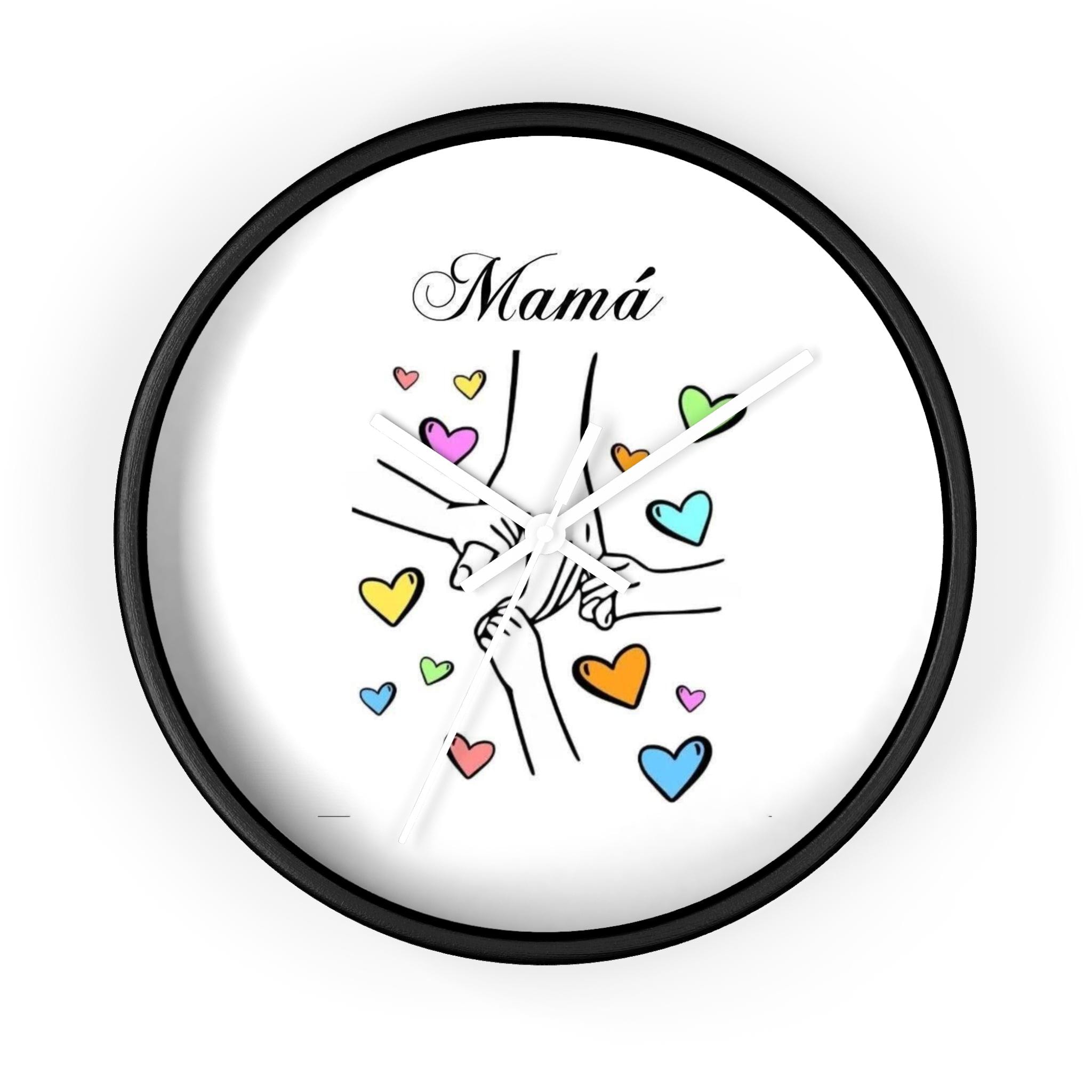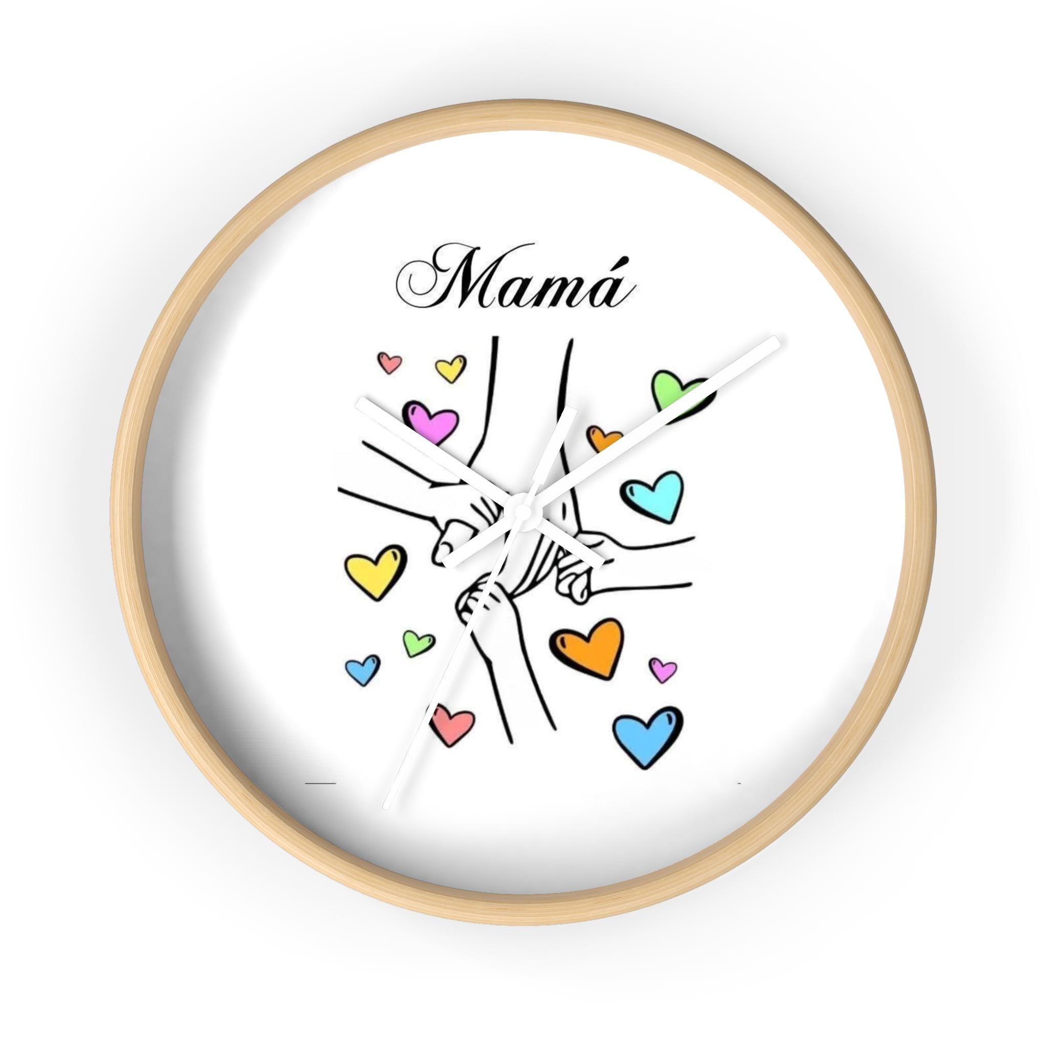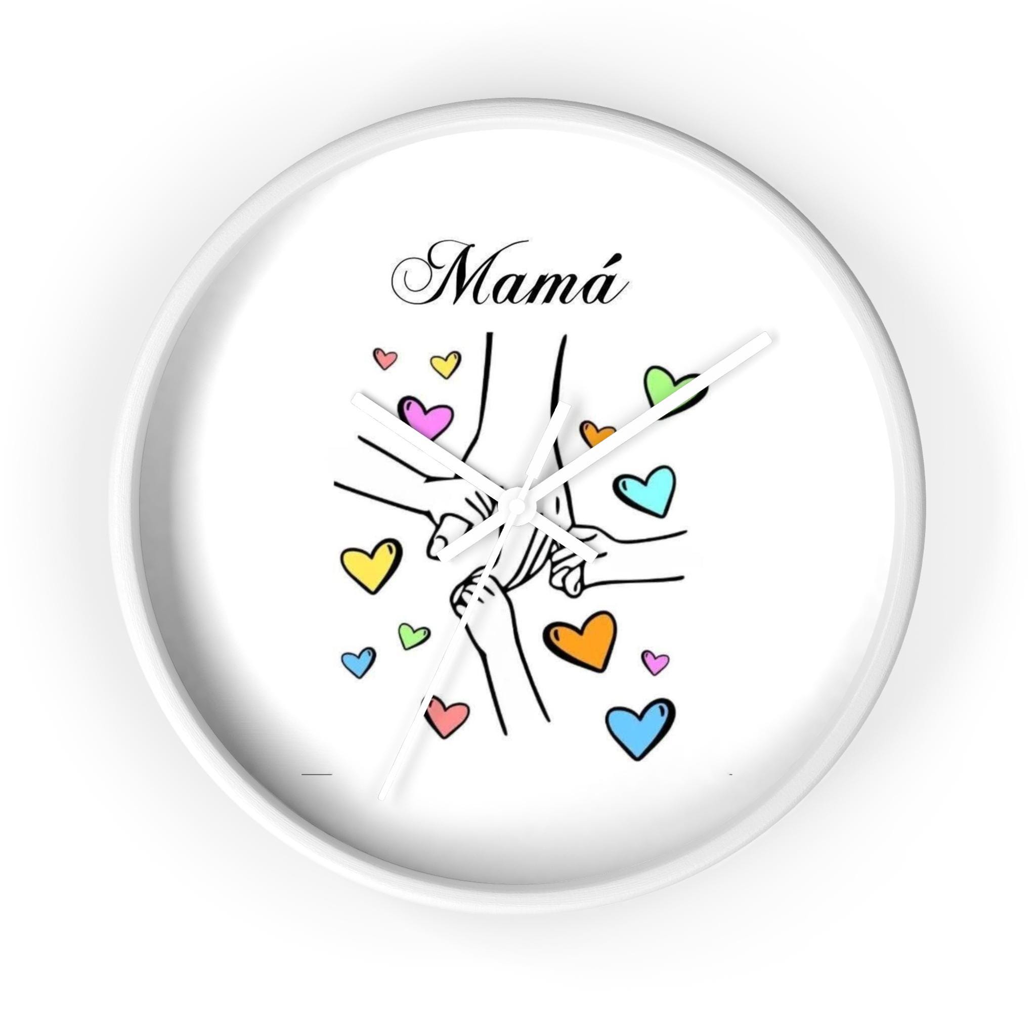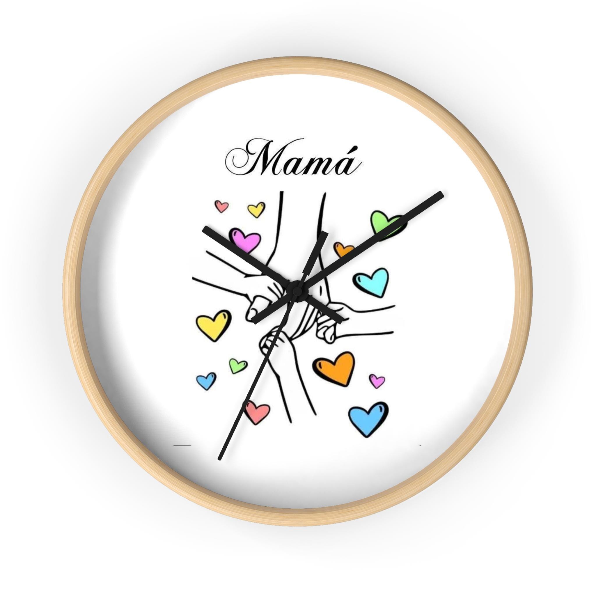 This wall clock brings a warm, tender moment to any room — a simple sketch of linked hands surrounded by soft, colorful hearts and the word “Mom” above. It reads like a little reminder of everyday love: quiet mornings, school-day rushes, bedtime stories. The clean white face and playful pastel hearts keep the mood light and sincere, while the thin black hands and choice of frame finish let it blend with both modern and cozy decor. Hang it in the kitchen, nursery, or beside a favorite chair to keep family close, minute by minute.