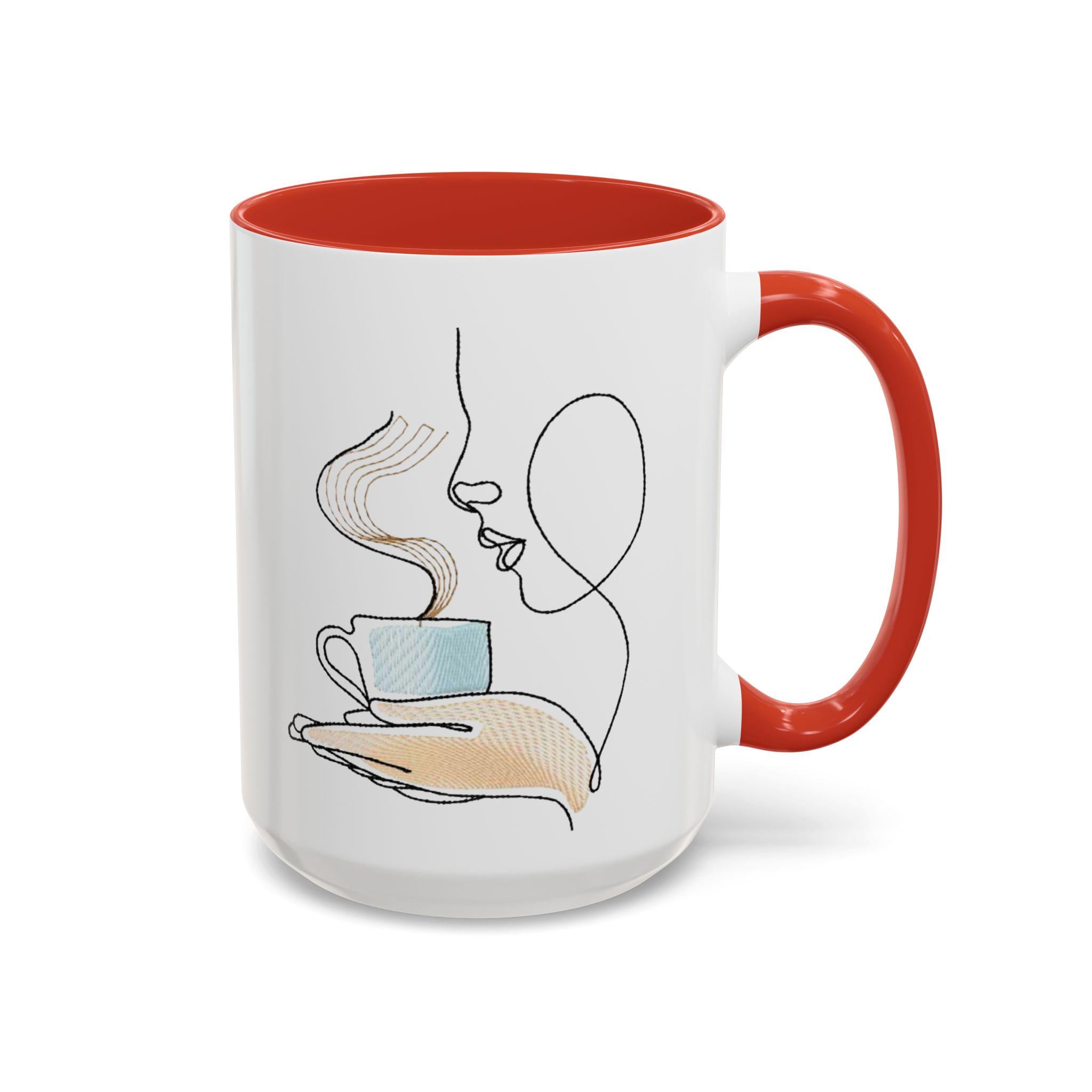 Soft morning light, a slow inhale, and the quiet company of a warm cup — this ceramic mug brings that calm into everyday routines. A single-line illustration of a person savoring steam from a small blue cup wraps gently around the glossy white body, while a contrasting colored interior and handle add a modern, artistic pop. It feels like a moment of pause: coffee or tea cradled in your hand, breathing steady, thoughts gathering. Use it at your kitchen table, on a cluttered desk between meetings, or tucked into a reading nook during a rainstorm. The design speaks to lovers of minimal, contemporary art and anyone who treasures small rituals that center the day.